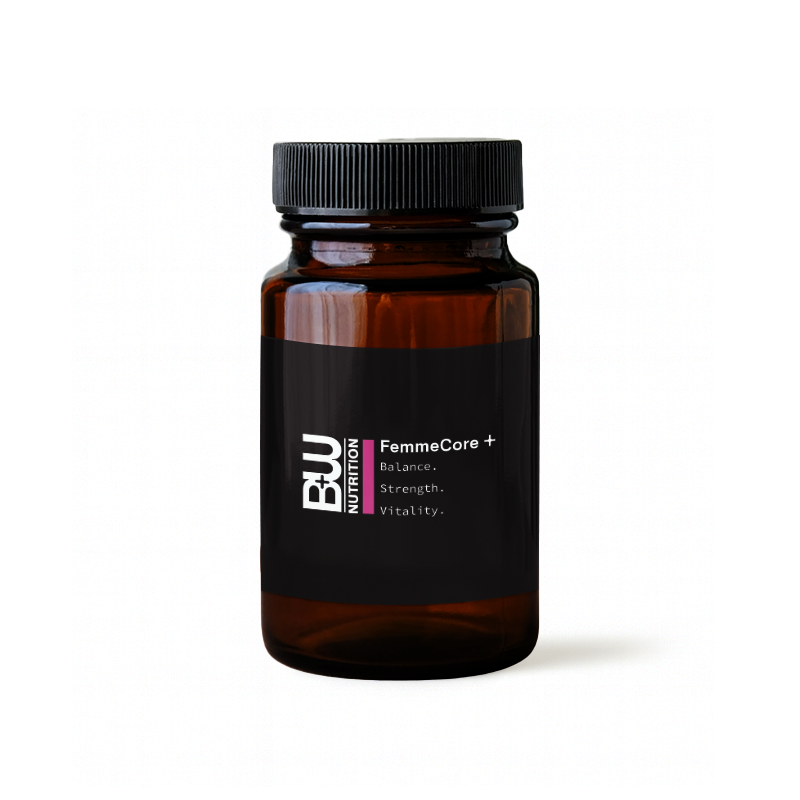B+W FemmeCore+ is a modern women’s wellness formula — combining adaptogens, botanical extracts, and functional nutrients to support hormonal health, energy, and wellbeing across the monthly cycle.